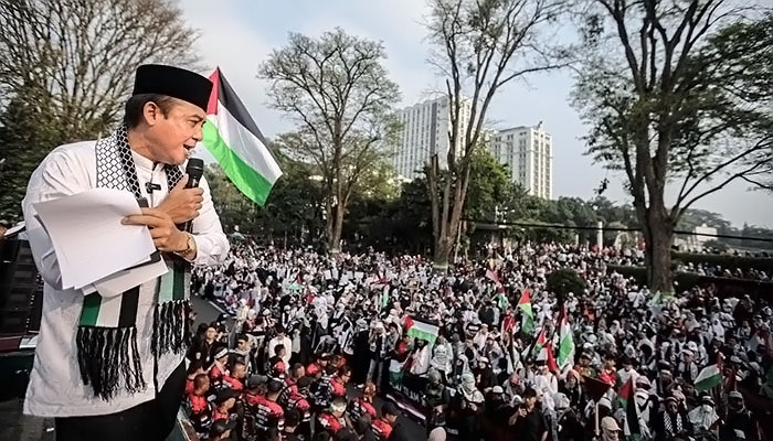 Wakil Wali Kota Bandung, Erwin, turut berorasi dalam aksi tersebut. Ia menekankan bahwa perjuangan rakyat Palestina bukan hanya urusan agama, tetapi juga kemanusiaan.