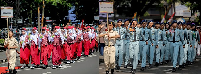 Derap langkah, dentuman drum marching band, dan kibaran bendera merah putih mewarnai acara ini.