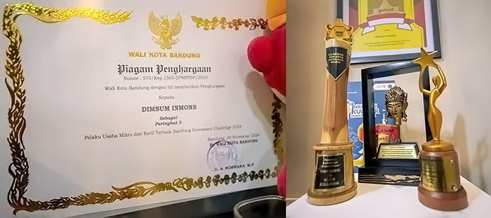Berkat dedikasi dan inovasinya, Dimsum Inmons telah meraih berbagai penghargaan bergengsi, seperti Juara 1 UMKM Award Kota Bandung.