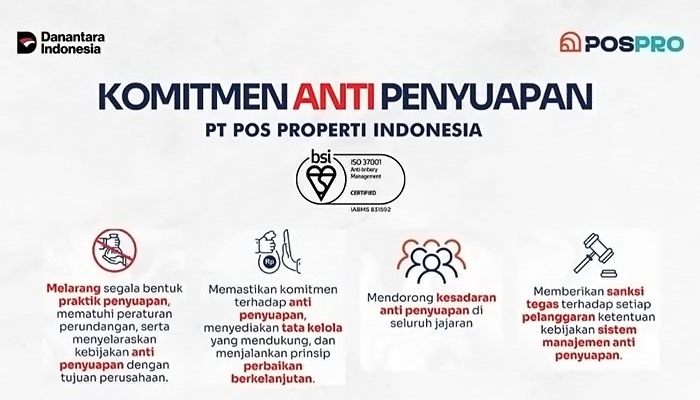 KABARHARMONI | JAKARTA, – PT Pos Properti Indonesia telah berhasil memperoleh sertifikasi ISO 37001:2016 terkait Sistem Manajemen Anti Penyuapan (SMAP).