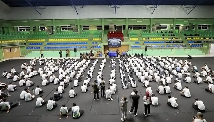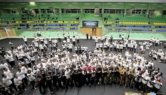 Para guru Pendidikan Jasmani, Olahraga, dan Kesehatan (PJOK) tingkat SD dan SMP mengikuti pelatihan Training of Trainers (ToT) Senam Penca di Gor KONI Bandung pada Senin, 22 September 2025.