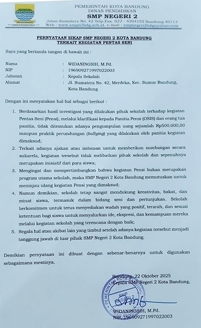 “Mengingat dan mempertimbangkan bahwa kegiatan Pensi bukan merupakan program utama sekolah, maka SMP Negeri 2 Kota Bandung memutuskan untuk meninjau ulang kegiatan Pensi yang dimaksud,” tertulis dalam poin ketiga pernyataan sikap.