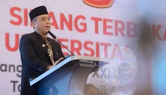 Wakil Wali Kota Bandung, Erwin, menyampaikan salam hangat dengan gaya khasnya yang penuh keakraban dan humor ringan. Membuat suasana wisuda menjadi cair dan bersemangat.