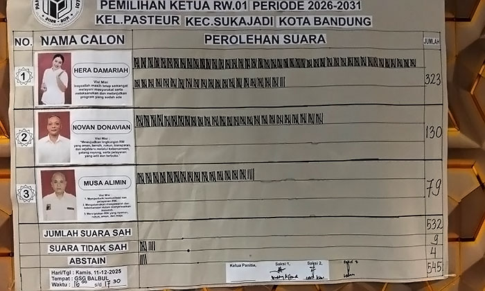KABARHARMONI | BANDUNG, Hera Damariah terpilih sebagai Ketua RW 01 Pasteur, Kecamatan Sukajadi, Kota Bandung, dengan raihan suara sah sejumlah 343 suara pada pemilihan yang berlangsung di Gedung Serbaguna RW 01 Balong Buleud pada Kamis, 11 Desember 2025.