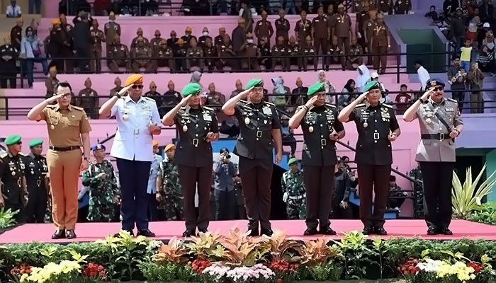 Prajurit TNI AD, TNI AL, TNI AU, Polri, Aparatur Sipil Negara (ASN), Komponen Cadangan, dan unsur masyarakat mengikuti upacara tersebut.