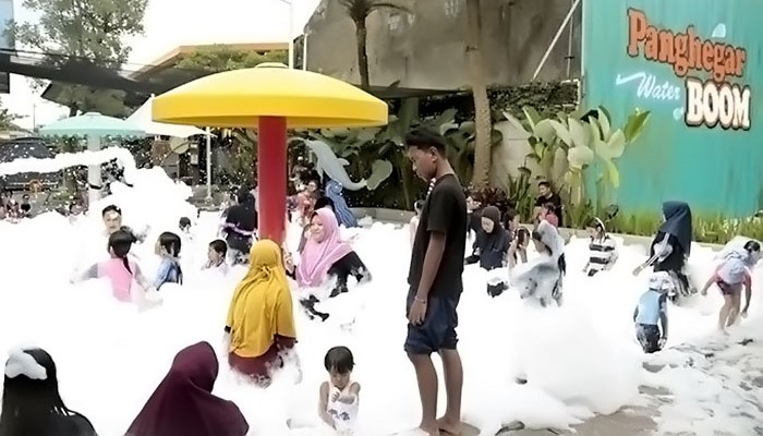Panghegar Waterboom mengadakan mandi busa setiap hari selama liburan, pukul 11.00 WIB dan 14.00 WIB.