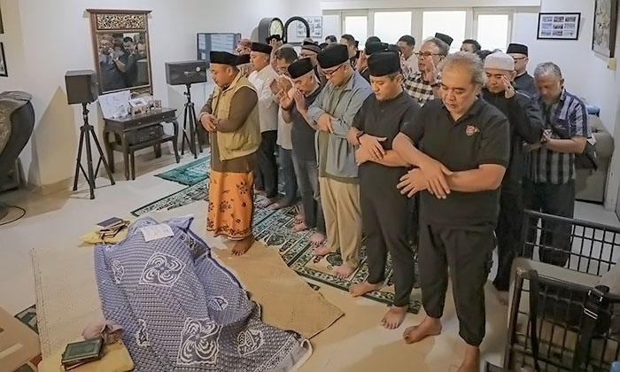 Keluarga dan para pelayat melaksanakan salat jenazah di kediaman almarhumah sebelum memakamkan jenazah.
